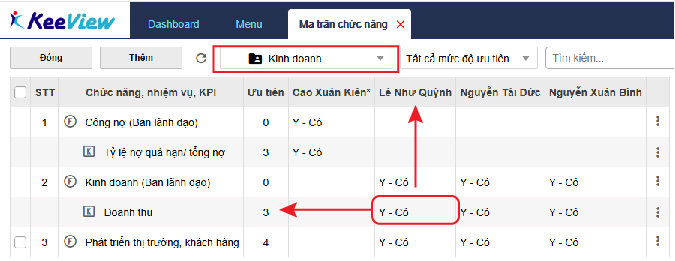 Phần mềm KeeView thực hiện xây dựng ma trận phân công chức năng, nhiệm vụ của các phòng ban trong bộ máy quản lý, làm cơ sở khoa học quan trọng cho việc tái cấu trúc tổ chức, xác định KPI hợp lý cho từng đơn vị và cá nhân. Quy trình thực hiện như sau: